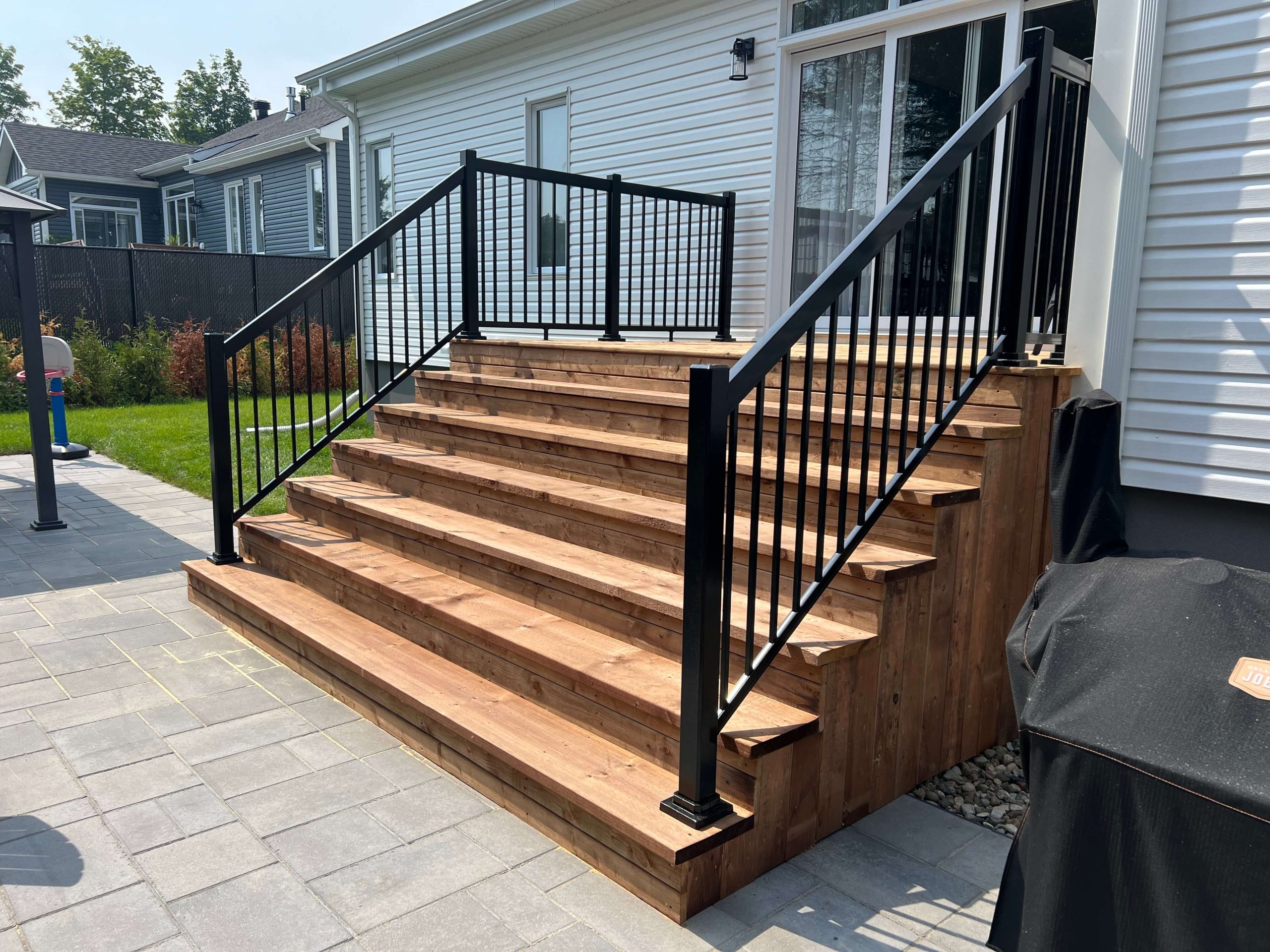 Composite decking is extremely durable, needs no maintenance, comes in a variety of colors, and there is no chance of getting splinters. Long term, you will save money as composite decking lasts much longer and requires no maintenance. Lasts upwards of 25 years as opposed to 10-15 with wood. The downsides of composite decking are the initial cost being more expensive than wood. The look and feel is not as natural as wood of course. It can also retain heat, making it hot to touch when in direct sun.